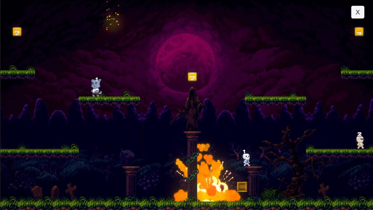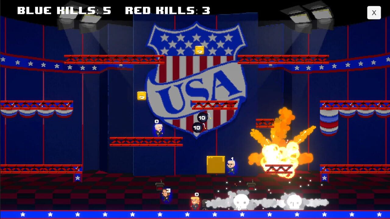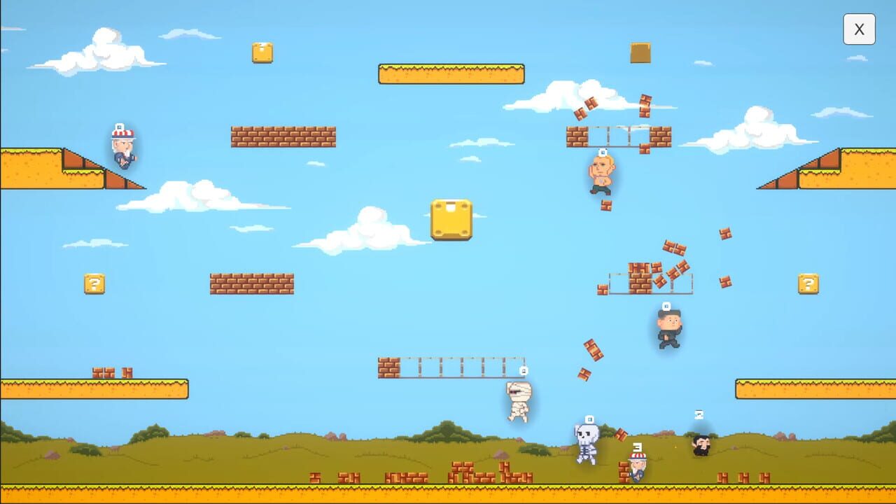 Super vs. World is a local-multiplayer 2D versus party game that lets up to 8 players combat each other and AI’s with classic headstomping, brick breaking, weapon throwing gameplay!
