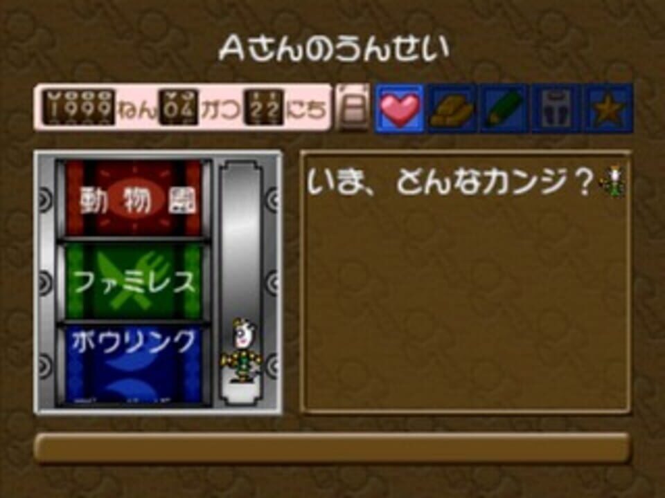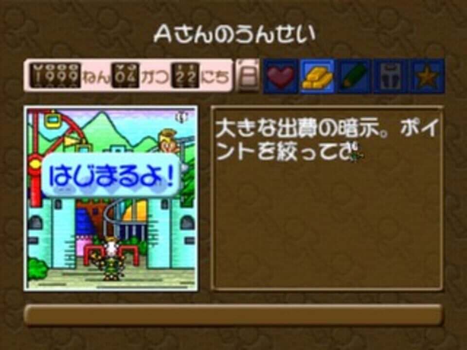 Taiyou no Otsuge is a tarot game in which the player provides the data and the game make a tarot diagnosis about love, study, work, health, luck, etc. The game features also some mini games.