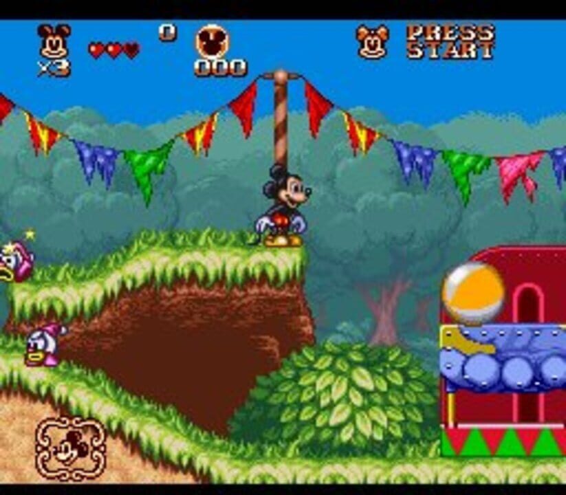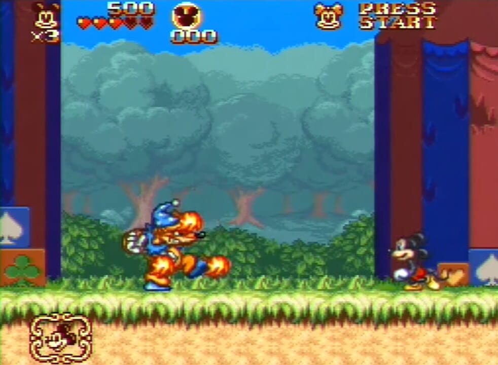 The game ditches the alternating two-player method in favor of simultaneous co-op. Another new feature is a password back-up. Both Mickey and Minnie are identical gameplay-wise, and the costumes they receive don't differ from each other in any aspec...