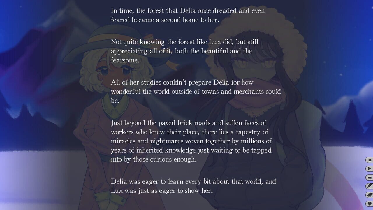 Alone as two, together as one - A fantasy/yuri visual novel telling the story of two girls traversing a snow covered forest and growing closer.