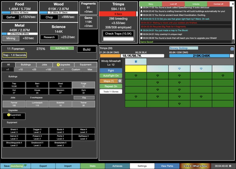 An incremental game focused on resource management where players command creatures called Trimps, using them to gather different materials, engage in combat, and return with new loot and upgrades.