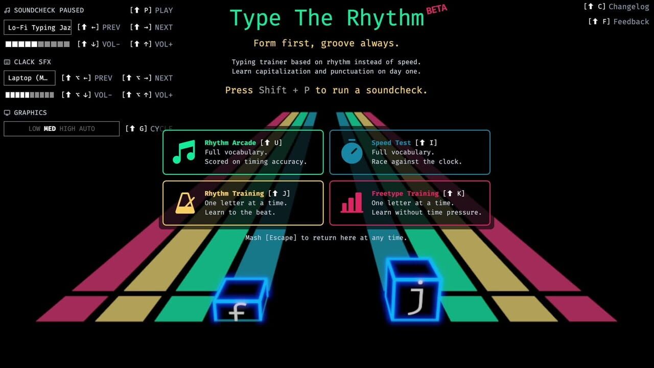 A rhythm typing trainer where you type real words to a variety of musical styles. Augmented proprioception lets you move the grooves between your brain and fingers for faster, cleaner typing. From hunt-and-peck to 150 WPM blindfolded, Type The Rhythm...