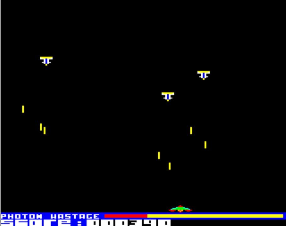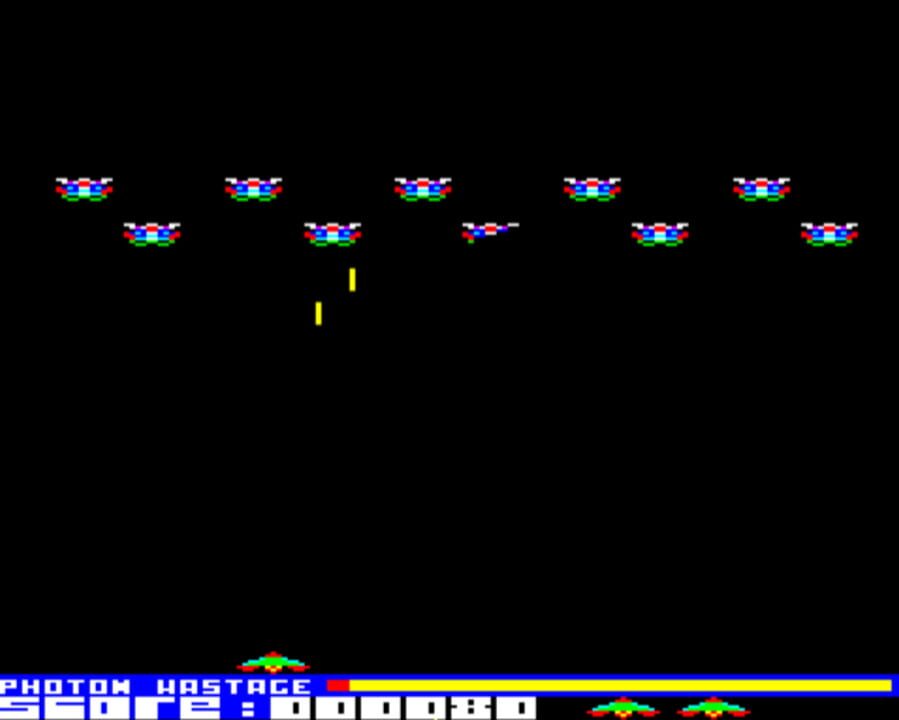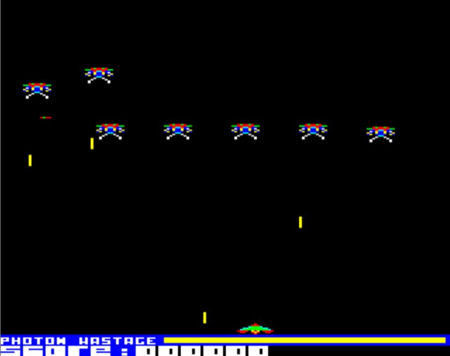 A Space Invaders clone in which the player controls the most powerful craft in the universe, the Ultron, at the bottom of the screen moving left or right and tries to defeat waves of aliens cascading down from the top.