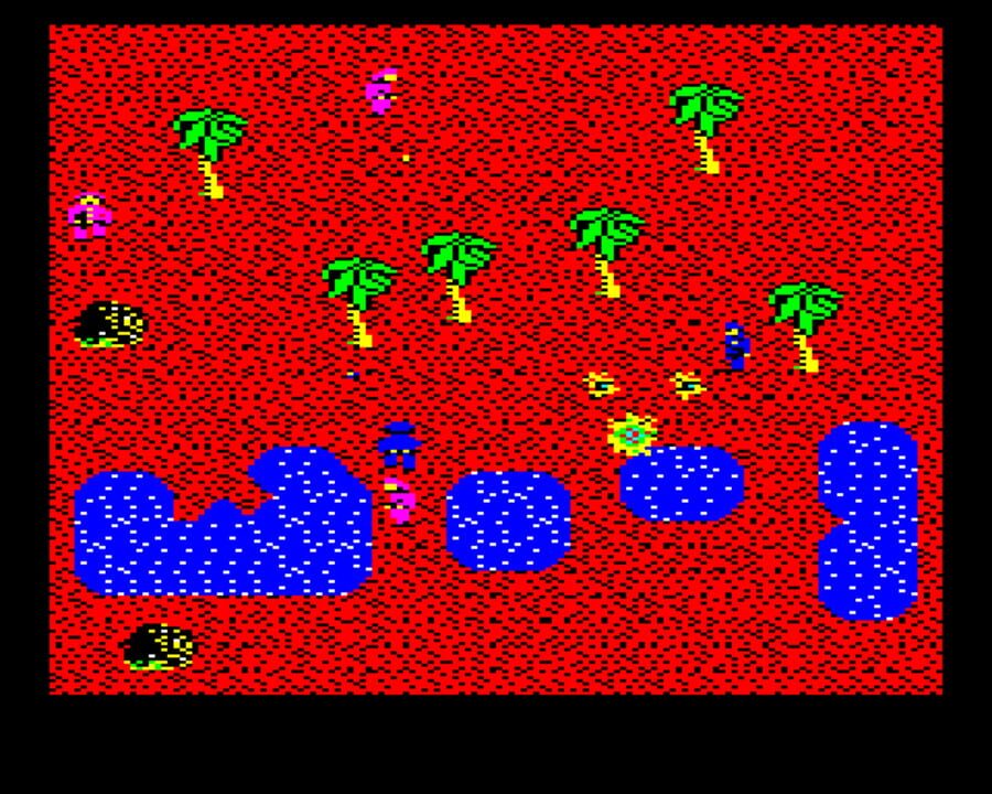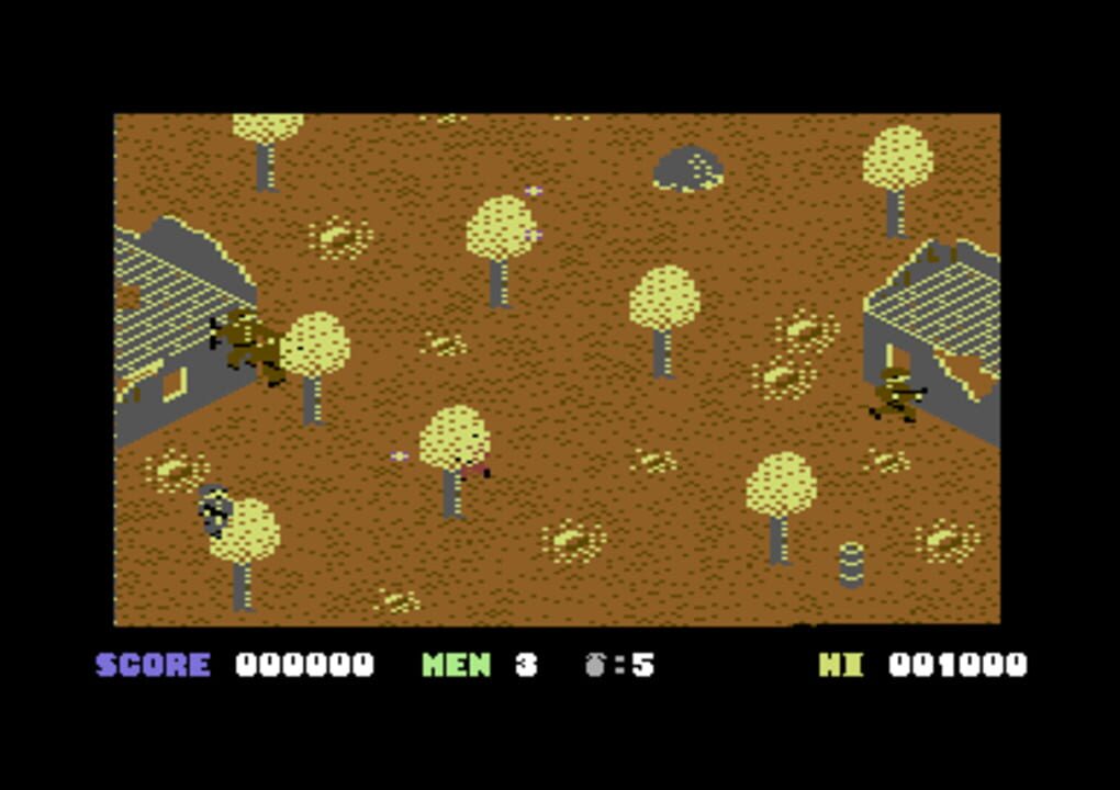 Eight invaded townships must be brought back under your control in this Commando-style shoot 'em up, which progresses vertically using a flick-screen system. You are armed with a rifle (activated by a short tap of the fire button) and five grenades (...