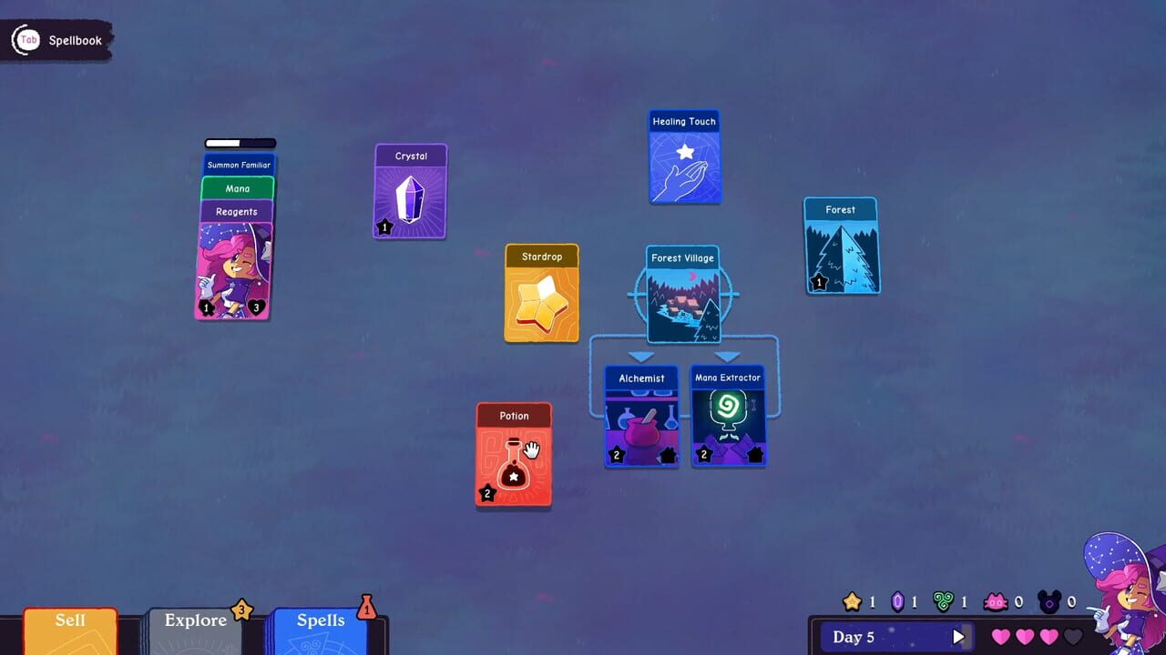 You're a witch, leading your coven into new, unfriendly lands. Use the cards you find to build and expand your civilization. Befriend the local covens or use their bones to fuel your spells. Gather your familiars, the witching hour is nigh.