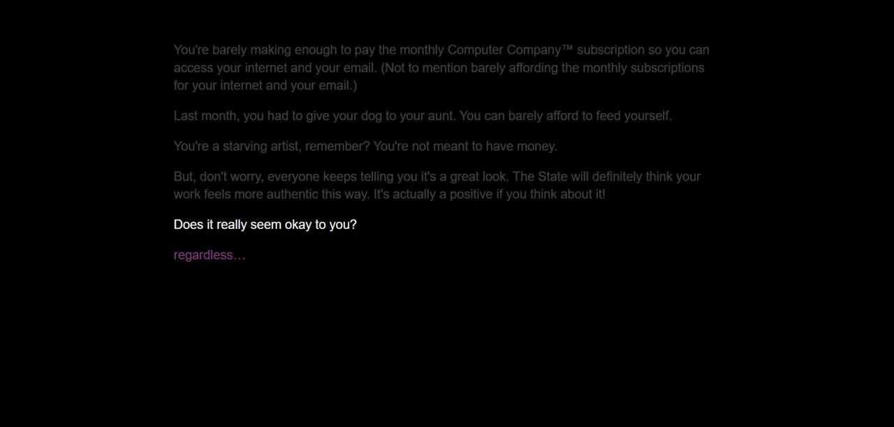 You need to buy a phone charger is a game about a struggling artist trying to buy a phone cable in a late-capitalist, enshittified-to-the-max, internet hellscape. Good luck!